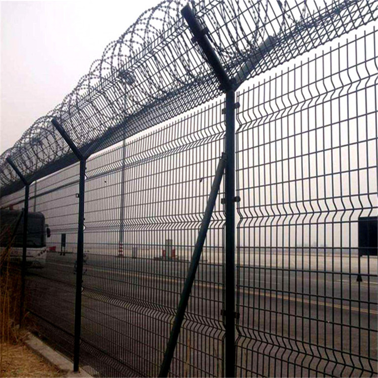 是護(hù)欄網(wǎng)的一種,頂端有V型支架,由于使用在機(jī)場(chǎng),所以防護(hù)性能要比其他的都要高,網(wǎng)子立柱都比較粗,而且采用防盜連接配件在頂端V型支架上還會(huì)安裝刀片刺繩并且通電,以達(dá)到最好的防護(hù)性能。