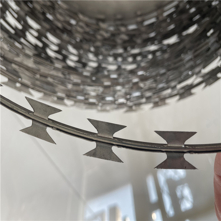 監(jiān)獄刀片刺繩是用在監(jiān)獄護欄網(wǎng)頂端的刀片刺繩,它是一種近年發(fā)展起來的防護、隔離能力較強的新型防護網(wǎng)產(chǎn)品。它采用鋼板沖壓成型包附于鋼絲之上,由銳利尖角鍍鋅鋼板或不銹鋼薄板做刀片,高張力鋼絲做芯線組合而成的。根據(jù)形狀可分為:螺旋式-刀片刺網(wǎng)、交叉式-刀刺網(wǎng)、平板式-刀片刺網(wǎng)、直線式-刀片刺網(wǎng)。被廣泛應(yīng)用在監(jiān)獄,機場,軍事基地等高安全場所。