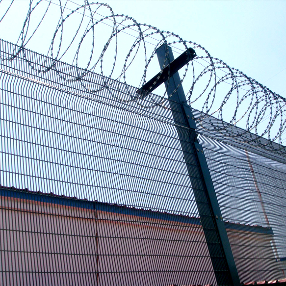 獄墻隔離網(wǎng)是由立柱和網(wǎng)片組成,并在網(wǎng)體頂部焊y型托架,圍圈盤放刀片刺絲,也有會(huì)在網(wǎng)體的上中下橫向,縱向,斜向交錯(cuò)綁定刀片刺絲,能有效防止攀爬逃竄,這樣威懾力更大,防范效果更好。