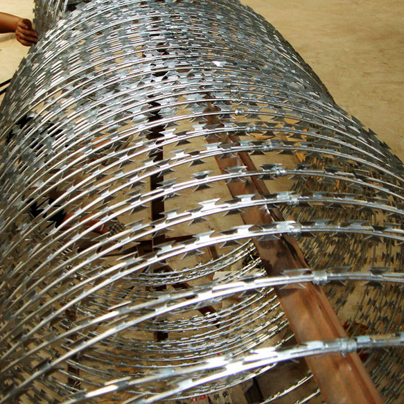 不銹鋼刀刺網(wǎng)又名刮刀型刺絲,是近年來興起的一種物理防護產(chǎn)品。鋒利的刀型刺由雙線扣裝后成蛇腹?fàn)?,既美觀又起到震懾效果。被應(yīng)用在軍事重地、監(jiān)獄、政府機關(guān)、銀行,以及生活小區(qū)圍墻、私人住宅、別墅的圍墻、門窗、高速公路、鐵路護欄以及邊境線等用來防護安保產(chǎn)品。