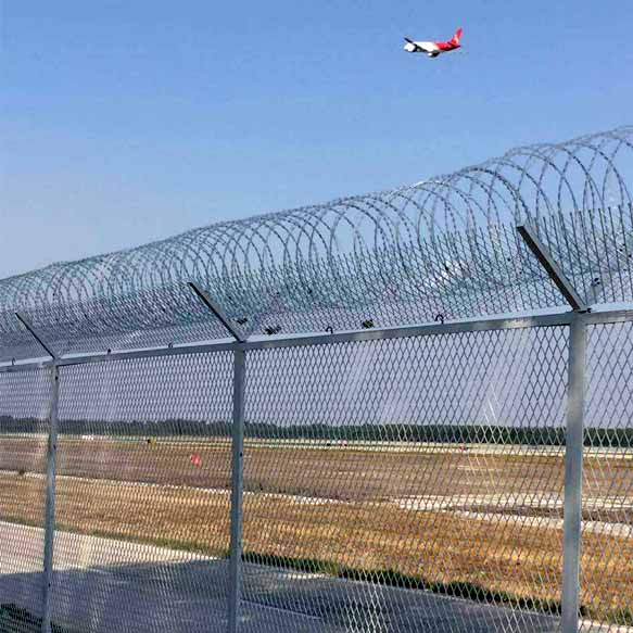 飛機(jī)場圍界網(wǎng)頂部加裝螺旋刀片刺網(wǎng)、螺旋刀片刺網(wǎng)大大增強(qiáng)了安全防護(hù)性能。采用電鍍、熱鍍、噴塑、浸塑等防腐表面處理,具有很強(qiáng)的抗老化、抗曬、耐腐蝕等優(yōu)異特點(diǎn)。其產(chǎn)品造型美觀、顏色多樣,既起到圍護(hù)的作用,又起到美化的作用。由于具有安全性高、防攀爬能力好,網(wǎng)片連接方式采用特制SBS緊扣件,有效的制止了人為破壞性的拆卸,橫向四道折彎加強(qiáng)筋,使網(wǎng)面強(qiáng)度更加增強(qiáng)。