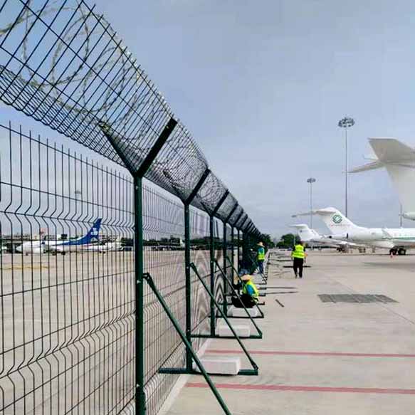 機(jī)場圍網(wǎng)主要用V型支架立拄,加強(qiáng)型焊接片網(wǎng),安全防盜連接件和熱鍍鋅刀片刺籠組成強(qiáng)度和安全防御性級別很高.近年來,被廣泛應(yīng)用在機(jī)