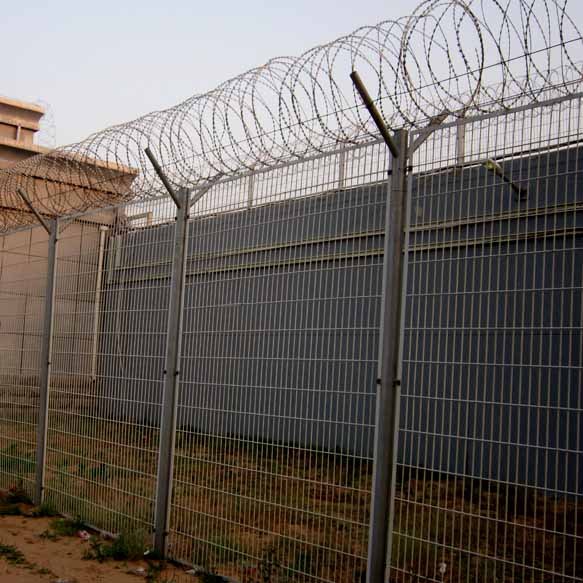 監(jiān)獄護(hù)欄網(wǎng)又稱作“Y型安全防御護(hù)網(wǎng)”和機(jī)場護(hù)欄網(wǎng)通用,是由V型支架立柱,加強(qiáng)型焊接片網(wǎng),安全防盜連接件和熱鍍鋅刀片刺籠組成強(qiáng)